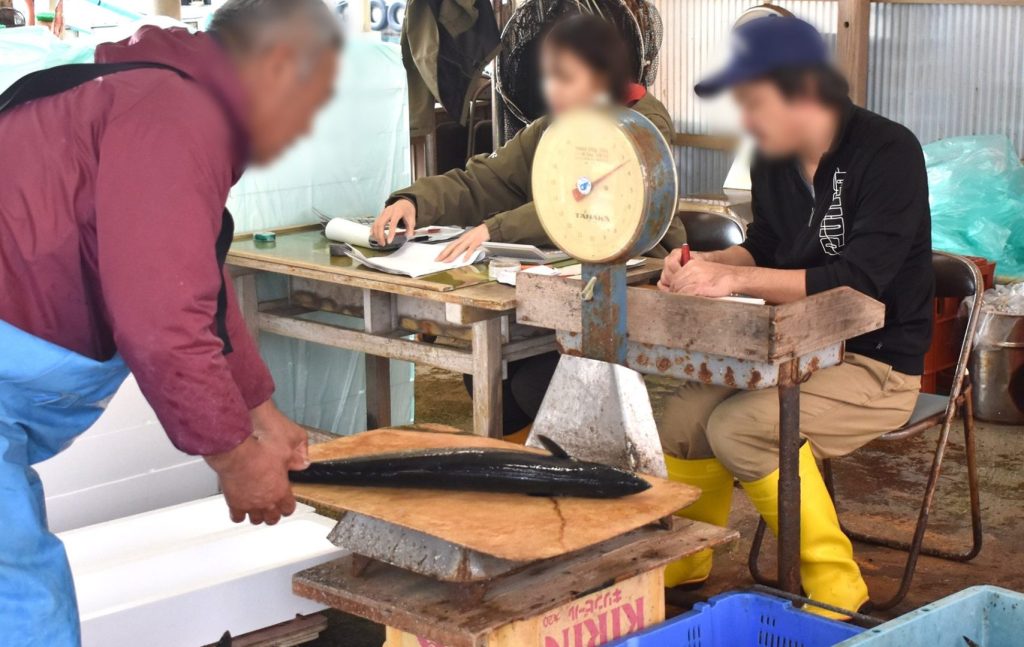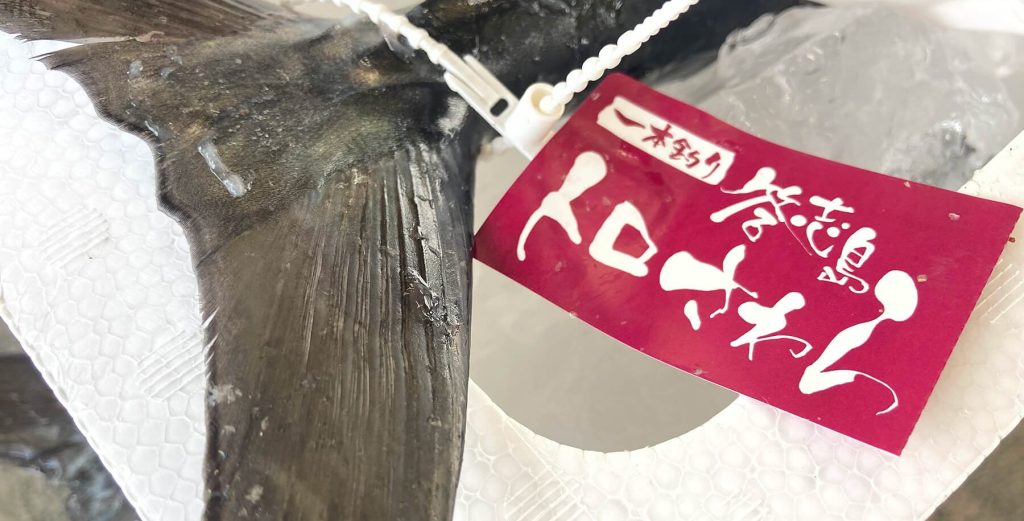 ブランドに認定された個体は、尾のくびれにロゴが入った赤紫のタグがくくりつけられます。タグの裏には漁獲した漁船名も明記されています。もし、料理店や市場で魚をさばいた際に「身割れ」(身の繊維がほぐれて割ける現象。船上で魚を落とした際などに発生する場合があります)が見つかった場合に、漁師まで遡って確認できるようになっています。これは「最後まで責任を持ちたい」という漁師たちの強い思いから生まれた仕組みです。